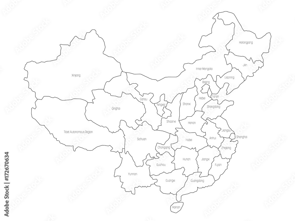 Regional map of administrative provinces of China. Thin black