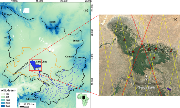 a) Location map of the Lake Chad Basin (~2.5 ร 10 6 km 2 ) with